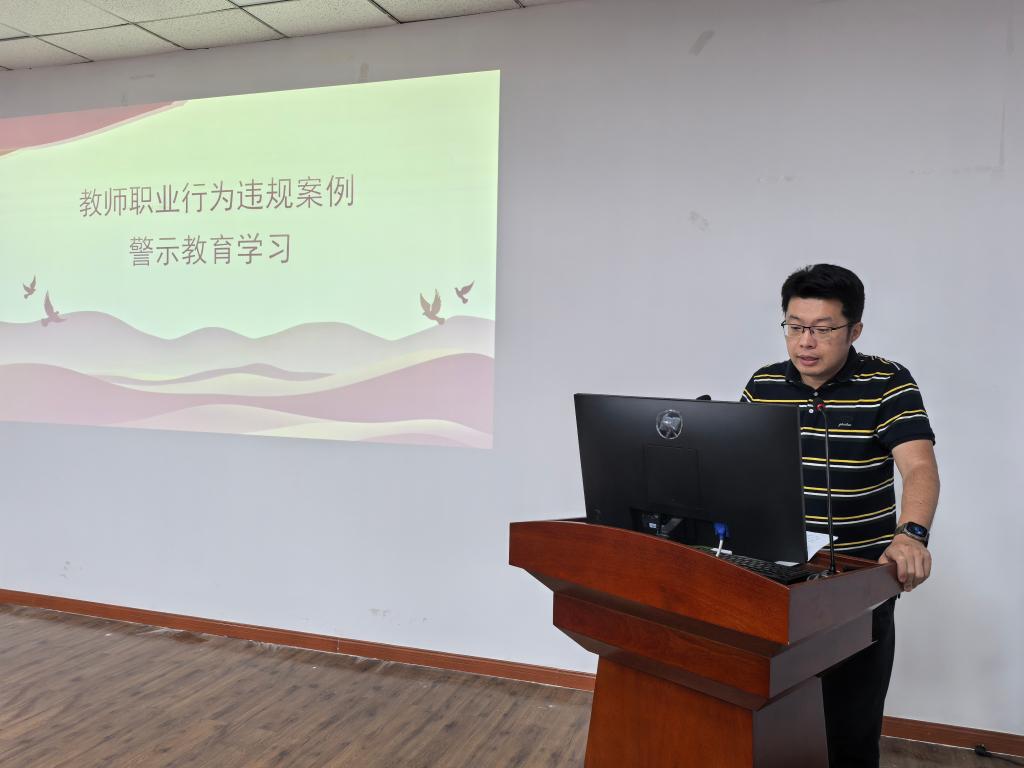 隨后,學(xué)院副院長(zhǎng)王現(xiàn)勛帶領(lǐng)全體教職工進(jìn)行了師德師風(fēng)主題學(xué)習(xí)教育活動(dòng)。他以教育部近期發(fā)布的違反教師職業(yè)行為十項(xiàng)準(zhǔn)則典型案例為切人點(diǎn),對(duì)違反師德師風(fēng)的典型案例進(jìn)行剖析,并帶領(lǐng)大家認(rèn)真學(xué)習(xí)了習(xí)近平總書記重要講話精神,圍繞教育強(qiáng)國建設(shè)的戰(zhàn)略背景、重大意義及實(shí)施路徑展開探討,強(qiáng)調(diào)教師需提升自身師德師風(fēng)修養(yǎng),為教育強(qiáng)國建設(shè)貢獻(xiàn)力量。