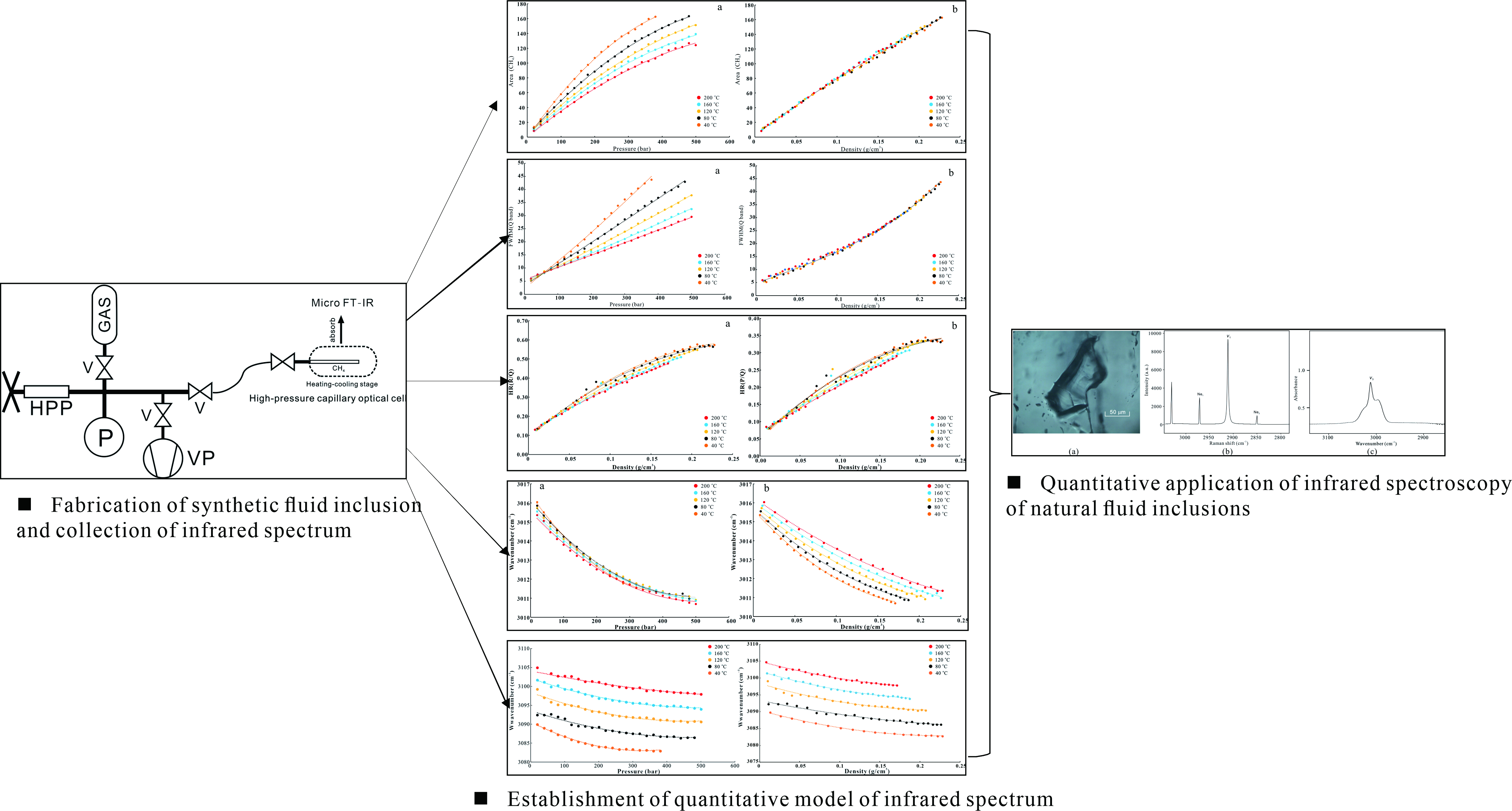 本次研究首次建立了甲烷(40-200oC,2-50 MPa)和二氧化碳(40-120oC,6-50 MPa)體系下傅里葉紅外光譜參數(shù)與溫度-壓力-密度的定量模型(圖1),同時分別對阿爾卑斯山中央?yún)^(qū)石英脈體內(nèi)多個純甲烷天然流體包裹體和鶯歌海盆地的純二氧化碳流體包裹體應用了傅里葉紅外光譜的定量方法,此研究不僅創(chuàng)新性的采用傅里葉紅外光譜定量分析應用于流體包裹體地球化學研究方向,同時比較了傅里葉紅外技術與激光拉曼技術的優(yōu)缺點,為下一步含甲烷和二氧化碳多元體系傅里葉紅外光譜定量打下了基礎。黃亞浩為論文第一作者,合作者包括長江大學文志剛教授、中石油勘探開發(fā)研究院陶小晚高工、杭州地質(zhì)研究院喬占峰教授等。該研究得到國家自然科學基金資助項目支持。(審核 孟強)