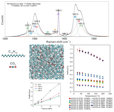 CO2提高原油采收率(CO2-EOR)能夠?qū)崿F(xiàn)地下二氧化碳封存的可能性,從而同時(shí)應(yīng)對(duì)能源需求和氣候問(wèn)題。本研究建立了一種原位方法,用于在廣泛的壓力-溫度(P-T)條件下測(cè)量CO2在十六烷烴中的溶解度。通過(guò)在已知體積的CO2和十六烷烴混合后,將其置于硅毛細(xì)管中,并在特定P-T條件下達(dá)到平衡后,利用拉曼光譜進(jìn)行檢測(cè),建立了CO2在十六烷烴中的摩爾分?jǐn)?shù)與拉曼峰面積比值之間的關(guān)系。結(jié)果表明,CO2的溶解度隨著溫度的升高而降低,隨著壓力的增加而升高。為了補(bǔ)充實(shí)驗(yàn)數(shù)據(jù),還進(jìn)行了混合式大正則系綜蒙特卡洛/分子動(dòng)力學(xué)(GCMC/MD)模擬,以研究CO2/十六烷烴體系的膨脹效應(yīng)以及CO2在十六烷烴中的擴(kuò)散行為。模擬結(jié)果通過(guò)拉曼光譜、先前發(fā)表的CO2溶解度數(shù)據(jù)以及基于遺傳算法(GA)的預(yù)測(cè)模型進(jìn)行了驗(yàn)證,三者高度吻合并相互印證。基于分子模擬結(jié)果,研究揭示了在類似體系的溶解度計(jì)算中考慮體積變化以提高預(yù)測(cè)模型精度的必要性。此外,與溫度相比,壓力對(duì)擴(kuò)散系數(shù)的影響相對(duì)較小。最終,本研究為在廣泛的P-T條件下測(cè)定多種流體溶解度的原位探測(cè)技術(shù)提供了解決方案,這些過(guò)程支持CO2-EOR以及地下碳封存操作。