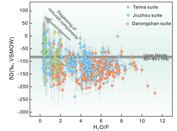 研究發(fā)現,熔體的Cl/F比值自西南向東北短暫升高后逐漸遞減,揭示源區(qū)鹵素組成包含東北方向俯沖板片脫水的貢獻,暗示其與古特提斯洋殼俯沖相關(圖2)。磷灰石的δ18O值高于地幔值并且相對一致(9.7‰–12.1‰),指示其為變沉積巖部分熔融;而δD值變化較大,最低可達 –238.6±27.2‰,與地幔過渡帶特征相符,表明該套S型花崗巖形成過程中存在深部地幔流體的參與(圖3)。