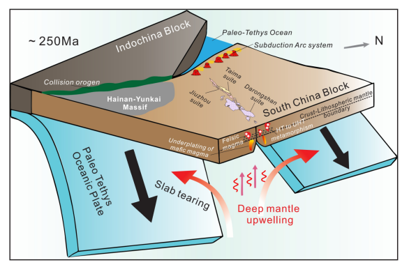 綜合揮發(fā)組分特征與區(qū)域構造背景,研究認為:古特提斯洋的東北向俯沖及隨后的板片撕裂誘發(fā)深部地幔熔融,基性巖漿底侵促使地殼熔融,從而形成了該高溫S型花崗巖帶(圖4)。該成果不僅拓展了對高溫S型花崗巖成因機制的理解,也為厘清晚古生代至早中生代華南板塊的構造演化提供了關鍵證據。