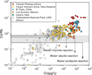 (2)對于大部分地熱系統(tǒng),水–巖反應是高溫地熱流體中Li、Rb、Cs的主要來源機制。然而,在部分鋰、銣、銫富集程度極高的地熱系統(tǒng)(如中國藏南、新西蘭Taupo Volcanic Zone、智利El Tatio等)中,地熱水中普遍表現(xiàn)出Cs含量高于Rb的反常特征,這一現(xiàn)象難以通過常規(guī)的水–巖反應或次生礦物吸附機制予以解釋(圖2,圖3)。結(jié)合構(gòu)造與巖漿活動背景推測,這類系統(tǒng)極有可能受到高分異巖漿流體的持續(xù)影響,從而誘發(fā)了Rb與Cs之間的分餾行為。