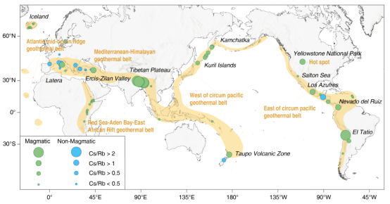 基于上述問題,我院水文與環(huán)境系劉明亮副教授聯(lián)合中國科學院地質(zhì)與地球物理研究所孔彥龍研究員及中國地質(zhì)大學(武漢)郭清海教授,圍繞高溫地熱系統(tǒng)中Li、Rb、Cs的來源與富集機制開展了系統(tǒng)研究。研究團隊梳理并整合了全球典型巖漿-熱液高溫地熱系統(tǒng)的地熱水水化學數(shù)據(jù)(圖1),分析了Li、Rb、Cs的空間分布特征及其與熱儲溫度、鹽度和圍巖化學成分的耦合關(guān)系,進一步厘清了水–巖反應、巖漿流體輸入與構(gòu)造背景對稀有金屬富集的控制機制,構(gòu)建了多階段富集演化模型,為關(guān)鍵礦產(chǎn)資源在地熱系統(tǒng)中的成礦機制提供了理論支撐。研究取得的主要認識和結(jié)論如下: