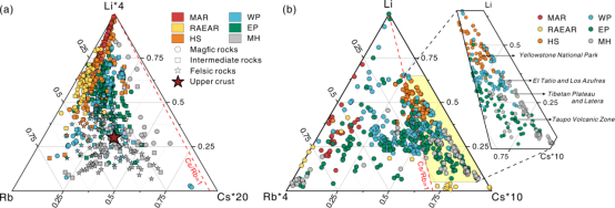 圖2 全球地熱帶不同類型巖石(a)與巖漿–熱液系統(tǒng)地熱水中鋰、銣、銫的三元圖