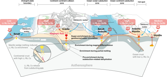 (3)在整合已有文獻與本研究數(shù)據(jù)的基礎(chǔ)上,提出了適用于巖漿-熱液系統(tǒng)中Li、Rb、Cs富集的四階段演化模式:俯沖帶脫水過程導致來自地殼沉積物和巖石的初始富集;地幔楔交代巖的部分熔融促進不相容元素進入熔體;巖漿在上升演化過程中發(fā)生結(jié)晶分異,致使殘余熔體中Li、Rb、Cs進一步富集;巖漿流體釋放并參與地熱水循環(huán),疊加強烈的水–巖反應過程,從熱儲巖石中持續(xù)萃取稀有金屬元素(圖4)。該模式全面刻畫了從深部地幔–地殼作用到地表熱液活動中Li、Rb、Cs的遷移與富集路徑,為相關(guān)資源的成礦機制研究提供了理論框架。