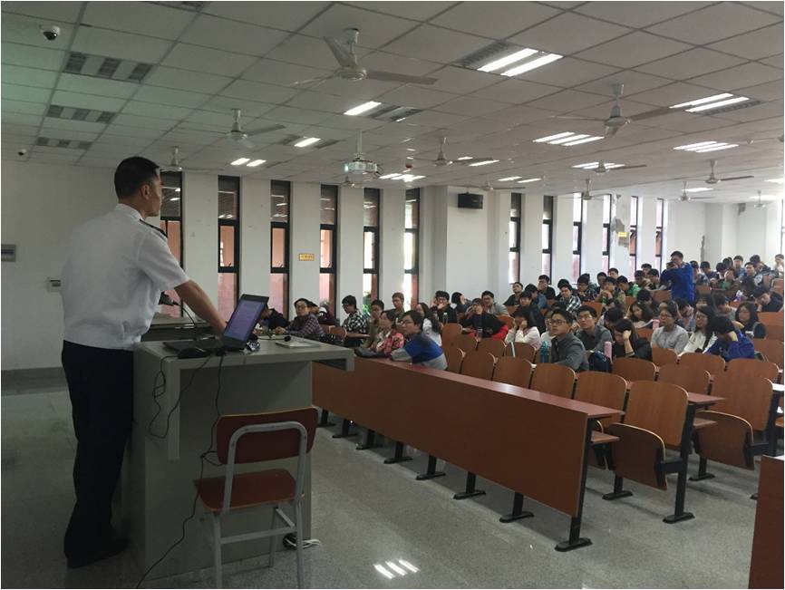 在講完自然災(zāi)害之后,謝小秋教官著重介紹了正確處理火災(zāi)的幾個(gè)方法。首先是冷靜報(bào)警,詳細(xì)、準(zhǔn)確的說出火災(zāi)的發(fā)生地點(diǎn)和起因。其次用了實(shí)力和數(shù)據(jù)圖文相結(jié)合的方法說明了處理火災(zāi)的兩個(gè)理念即:小火滅,大火跑。緊接著他有介紹了幾種逃生的方法和小技巧即冷靜、找準(zhǔn)方向和防煙。在這個(gè)階段他特別用實(shí)際情境說明了在不同的情況下該用不同的方法應(yīng)對。同時(shí)他也指出了目前消防救援存在的問題包括存在的防盜窗使得消防官兵無法進(jìn)入救援以及復(fù)雜的交通情況使得消防官兵無法快速到達(dá)現(xiàn)場。