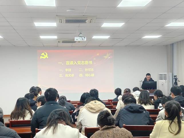 首先是接收預(yù)備黨員,由4名發(fā)展對象依次宣讀《入黨志愿書》,并向大會匯報對黨的認(rèn)識、入黨動機(jī)、個人情況以及需要向黨組織說明的問題。各發(fā)展對象入黨介紹人對發(fā)展對象的情況加以說明,并對其能否入黨表明意見。經(jīng)支部一致討論,同意接收李冠等4名發(fā)展對象為中共預(yù)備黨員。