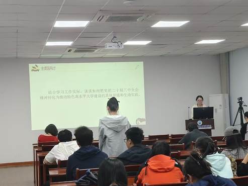 首先全體黨員起立重溫入黨誓詞,并進(jìn)行黨章的誦讀,時(shí)刻謹(jǐn)記要以馬克思列寧主義、毛澤東思想、鄧小平理論、“三個(gè)代表”重要思想、科學(xué)發(fā)展觀、習(xí)近平新時(shí)代中國特色社會(huì)主義思想作為自己的行動(dòng)指南。隨后進(jìn)行理論學(xué)習(xí),習(xí)近平總書記在中共中央政治局第十五次集體學(xué)習(xí)中時(shí)強(qiáng)調(diào)“貫徹落實(shí)新時(shí)代黨的建設(shè)總要求 進(jìn)一步健全全面從嚴(yán)治黨體系”,同時(shí)警示我們要堅(jiān)持“融入日常、抓在經(jīng)常”,把黨紀(jì)學(xué)習(xí)教育成果持續(xù)轉(zhuǎn)化為推動(dòng)高質(zhì)量發(fā)展的強(qiáng)大動(dòng)力。 接著進(jìn)行了主題研討,就“結(jié)合學(xué)習(xí)工作實(shí)際,談?wù)勅绾伟腰h的二十屆三中全會(huì)精神轉(zhuǎn)化為推動(dòng)特色高水平大學(xué)建設(shè)的具體舉措和生動(dòng)實(shí)踐”這一主題進(jìn)行討論,現(xiàn)場(chǎng)氛圍活躍,熱情高漲,有十幾名黨員都發(fā)表了自己的獨(dú)到見解。