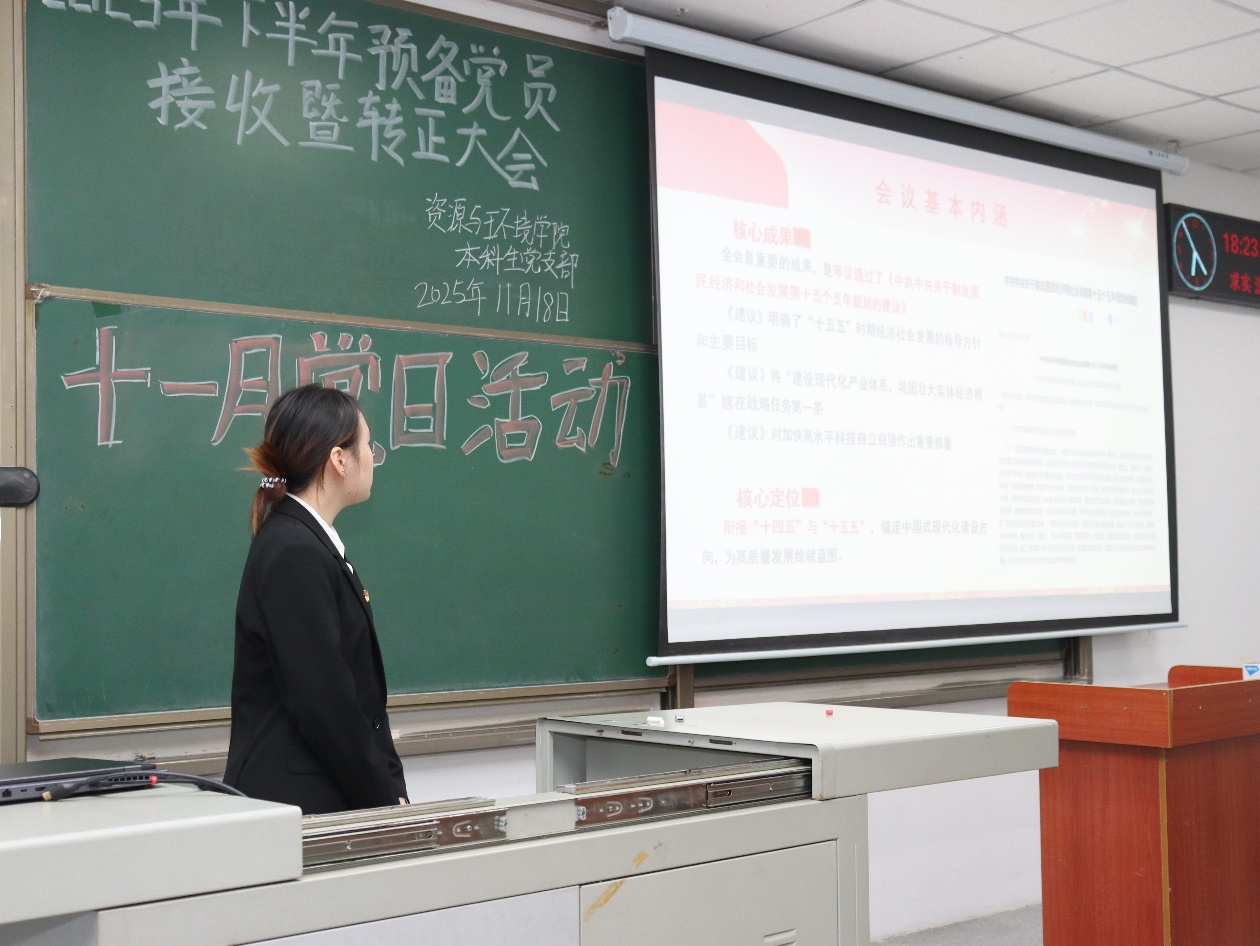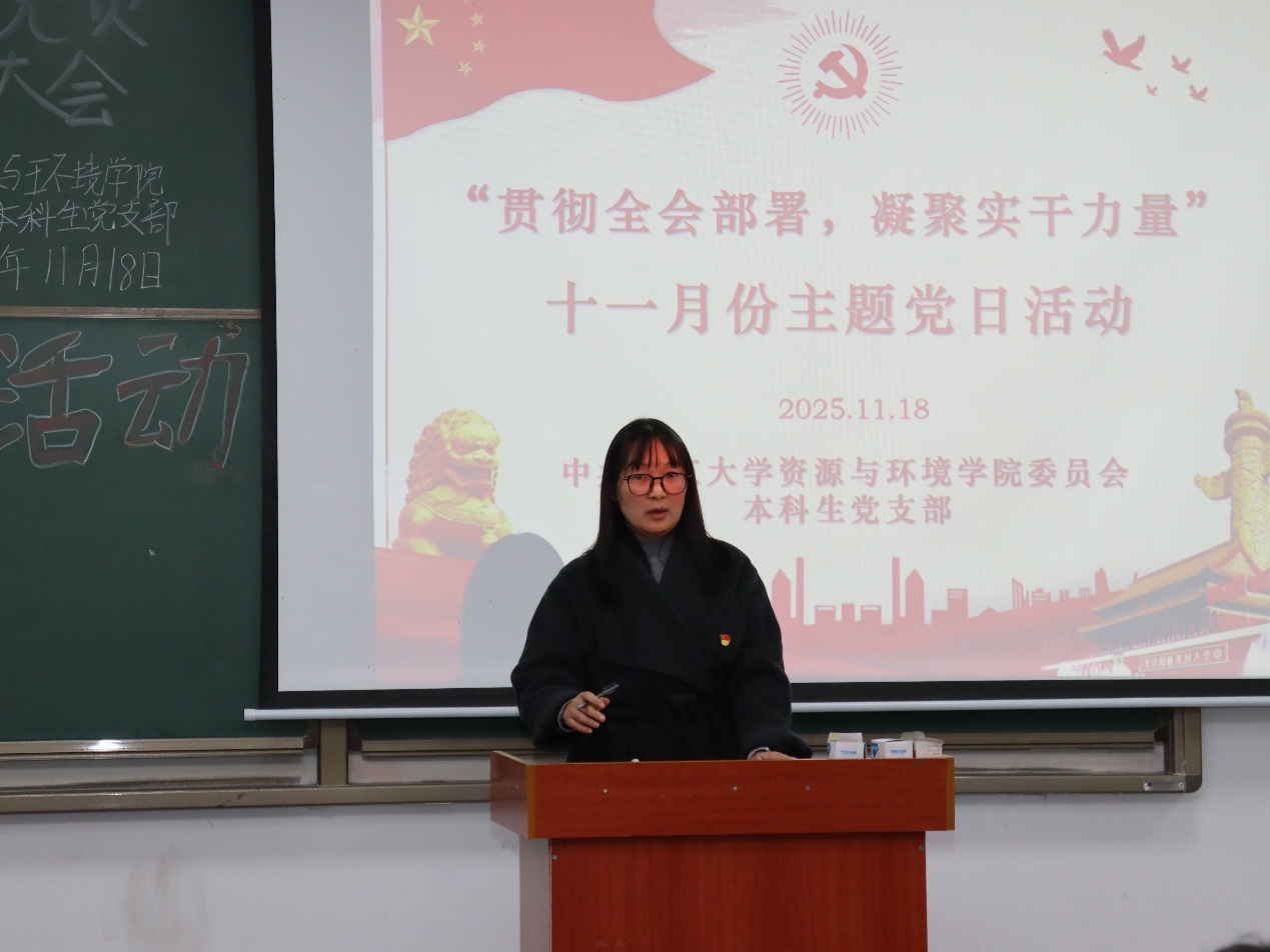 (通訊員 孫文靜)2025年11月18日下午6:00,本科生黨支部于武教A106召開以“貫徹全會(huì)部署,凝聚實(shí)干力量”為主題的十一月支部主題黨日活動(dòng)。本次活動(dòng)由黃宇同志主持,學(xué)工辦主任李春花老師及全體學(xué)生黨員參會(huì)。 會(huì)議伊始,全體黨員誦讀《中國(guó)共產(chǎn)黨章程》第一章,深入剖析黨的章程。隨后由張思陽同志開展微黨課學(xué)習(xí),帶領(lǐng)同志們深悟全會(huì)精神。接下來,由魏嘉豪同志以“走讀地質(zhì)文脈,守護(hù)綠色發(fā)展”為主題講授微黨課,進(jìn)一步強(qiáng)化全體黨員的初心使命。同學(xué)們就“結(jié)合崗位實(shí)際,談?wù)剬W(xué)習(xí)貫徹黨的二十屆四中全會(huì)精神的心得體會(huì)”相關(guān)主題展開熱烈討論。大家表示要夯實(shí)專業(yè)基礎(chǔ),勇攀科研高峰,加強(qiáng)理論學(xué)習(xí),深刻理解全會(huì)精神的核心內(nèi)涵與實(shí)踐要求,運(yùn)用所學(xué)知識(shí)服務(wù)社會(huì)、服務(wù)人民,在解決實(shí)際問題的過程中增長(zhǎng)才干。整個(gè)學(xué)習(xí)過程在快樂的氛圍中結(jié)束。 活動(dòng)結(jié)束后,李春花老師總結(jié)發(fā)言。她表示,此次黨日活動(dòng)不僅強(qiáng)化了支部黨員的理論素養(yǎng)和使命感,更激發(fā)了大家將愛國(guó)情、強(qiáng)國(guó)志、報(bào)國(guó)行自覺融入學(xué)習(xí)和未來事業(yè)的熱情。希望全體黨員繼續(xù)堅(jiān)守初心使命,勇于擔(dān)當(dāng)作為,為學(xué)院和學(xué)校的發(fā)展貢獻(xiàn)自己的力量。 審核(李春花)