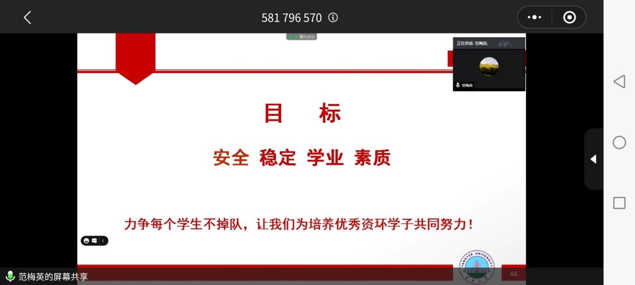 (通訊員 梁文萱 圖/文)健康的心靈是幸福的源泉,良好的教育是成功的基礎(chǔ)。為加強(qiáng)資源與環(huán)境學(xué)院的心理健康教育,提高資環(huán)學(xué)子的學(xué)習(xí)能力。2020年10月19日晚上19時(shí)整,資源與環(huán)境學(xué)院召開(kāi)的以“守護(hù)心靈,助力未來(lái)”為主題的線上會(huì)議。本次大會(huì)由黨委副書(shū)記范梅英老師主持。資源與環(huán)境學(xué)院團(tuán)委書(shū)記嚴(yán)麗萍老師,學(xué)生輔導(dǎo)員李春花老師,資環(huán)學(xué)院各班班主任出席了本次會(huì)議。