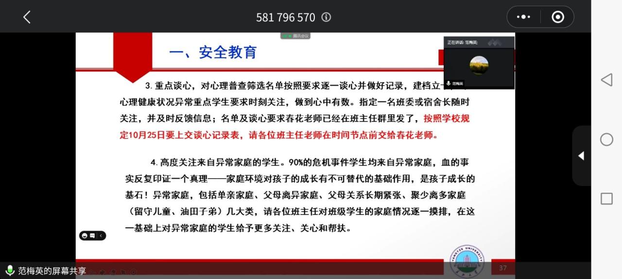 會(huì)議最后,由李春花老師補(bǔ)充說(shuō)明 。她再次強(qiáng)調(diào)了學(xué)生心理健康教育問(wèn)題的重要性,并對(duì)班主任在線上進(jìn)行了訪談培訓(xùn)。她強(qiáng)調(diào)對(duì)于存在心理健康問(wèn)題的學(xué)生,班主任們一定要主動(dòng)去溝通,委婉地去了解學(xué)生的情況。比如在詢問(wèn)學(xué)生情況時(shí),可以說(shuō):“你們家現(xiàn)在有幾口人”“最近有沒(méi)有遇見(jiàn)什么煩心事”等。以溫和的語(yǔ)氣和委婉的方式對(duì)學(xué)生進(jìn)行細(xì)心地疏導(dǎo)。