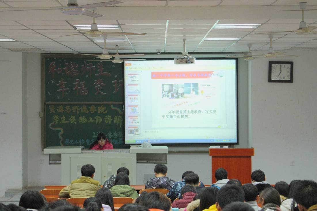 (通訊員 鐘寰/文 郝鴻博/攝)在寒風(fēng)陣陣的武漢校區(qū),資源與環(huán)境學(xué)院導(dǎo)師組工作仍在有條不紊的進(jìn)行。11月25日晚7點(diǎn),資源與環(huán)境學(xué)院在武培B103舉行了主題為“學(xué)生資助工作詳解”的導(dǎo)師組學(xué)習(xí)第十講講座,2016級(jí)輔導(dǎo)員李春花老師和全體大一同學(xué)共同參與了本次講座。