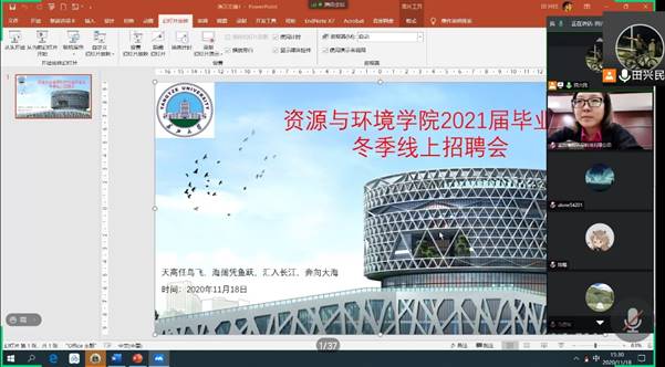 通訊員 嚴(yán)麗萍 田興民 文/圖),在新冠疫情的影響下,當(dāng)下畢業(yè)生的求職就業(yè)問(wèn)題變得越來(lái)越難,為了更好的解決畢業(yè)生就業(yè)難題,為廣大畢業(yè)生開(kāi)拓求職就業(yè)渠道,資源與環(huán)境學(xué)院于2020年11月18日下午 3點(diǎn)30分,通過(guò)騰訊會(huì)議在線(xiàn)招聘會(huì)的形式,為學(xué)院2021屆畢業(yè)生舉行了一場(chǎng)線(xiàn)上招聘會(huì)。本次招聘會(huì)我院共計(jì)邀請(qǐng)到了6家招聘單位,為學(xué)生進(jìn)行在線(xiàn)宣講。它們分別是武漢中地環(huán)科集團(tuán)有限公司、武漢猿輔導(dǎo)有限公司、武漢境輝環(huán)保科技有限公司、武漢鏈家宏業(yè)房地產(chǎn)經(jīng)紀(jì)有限公司和武漢地大華睿地學(xué)技術(shù)有限公司以及武漢時(shí)代地智科技股份有限公司。資環(huán)院2021屆畢業(yè)生(本科與研究生)均參與了本次招聘會(huì)。出席本次招聘會(huì)的還有資源與環(huán)境學(xué)院黨委副書(shū)記范梅英老師、分團(tuán)委書(shū)記嚴(yán)麗萍老師、學(xué)工辦辦公室主任李春花老師。