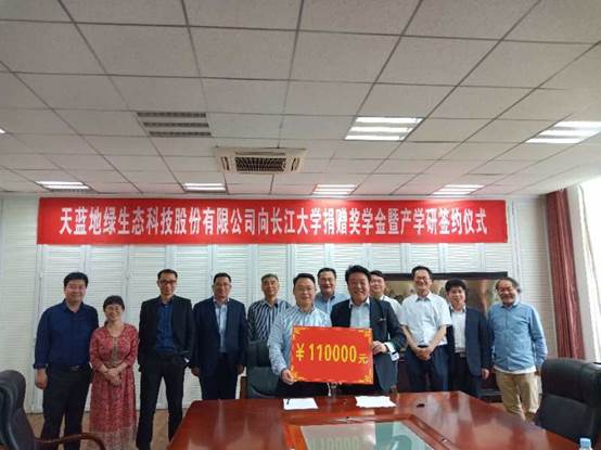 5月13日,湖北天藍地綠生態(tài)科技股份有限公司向資源與環(huán)境學院捐贈11萬元獎學金暨產(chǎn)學研合作簽約儀式在在武漢校區(qū)舉行。該公司董事長高文兵先生及部分高管、武漢校區(qū)副校長趙林、資環(huán)學院領(lǐng)導班子及部分教師代表出席簽約儀式。