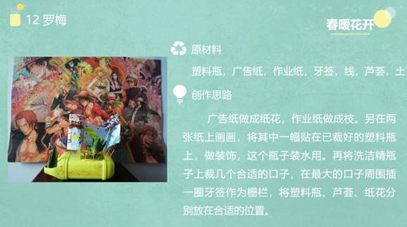 此次活動(dòng)是由2018年湖北省高校實(shí)踐育人特色項(xiàng)目支持,是《“長(zhǎng)大常青,碧水知音”環(huán)保志愿服務(wù)——長(zhǎng)江大學(xué) “常青生態(tài)”志愿者社會(huì)服務(wù)公益實(shí)踐》項(xiàng)目的重要實(shí)踐。共有參賽作品21個(gè),選手們按照順序依次對(duì)自己的作品進(jìn)行展示,并伴以精彩講解。從實(shí)用性、美觀性、創(chuàng)新性三個(gè)角度出發(fā),作品都體現(xiàn)了設(shè)計(jì)者的創(chuàng)新思想和環(huán)保理念,作品均是利用廢舊品設(shè)計(jì),變廢為寶,選材適宜,符合綠色環(huán)保概念,所有創(chuàng)意項(xiàng)目都令評(píng)委們耳目一新。其中,12號(hào)志愿者羅梅的作品令人驚嘆:花和蘆薈代表著春天來(lái)臨,萬(wàn)物復(fù)蘇,預(yù)示著一切美好事物即將來(lái)臨,柵欄為界,保護(hù)著蘆薈,恰如疫情期間最美的“逆行著”——全國(guó)各地奮戰(zhàn)在一線醫(yī)務(wù)人員,保護(hù)著每一位民眾。