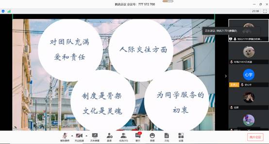 為加強學生與老師之間的聯(lián)系與交流,建設(shè)優(yōu)秀班級文化,創(chuàng)建良好班風,2020年4月26日下午19:00,資環(huán)學院采用線上騰訊會議的形式,召開了學生干部培訓會議,內(nèi)容包括學生干部經(jīng)驗分享、問題交流解答、老師總結(jié)發(fā)言。本次會議由水文21701班班長史心宇主持,學院黨委副書記范梅英書記、學生事務辦公室主任李春花老師及17-19級學生干部參加了會議。