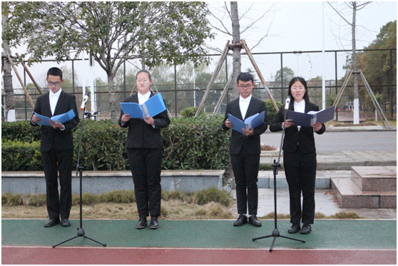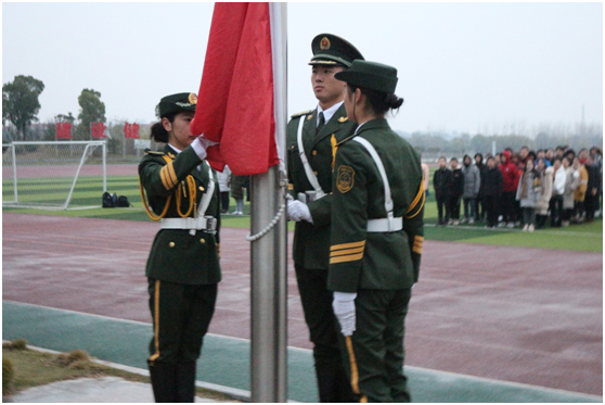 大會(huì)分為三個(gè)階段。第一階段升旗儀式,由長江大學(xué)國旗護(hù)衛(wèi)隊(duì)的隊(duì)員護(hù)衛(wèi)國旗,英姿颯爽,昂首挺胸地將國旗護(hù)送至升旗臺(tái)。伴隨激昂的《義勇軍進(jìn)行曲》,同學(xué)們將目光聚集在鮮艷的五星紅旗,冉冉升起的紅旗代表了祖國大地和資環(huán)學(xué)員從晨霧中破曉而出、朝氣蓬勃的模樣。