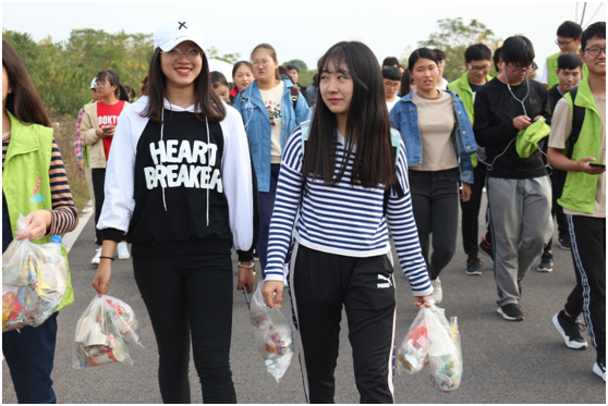 隨著活動的進行,同學們手中的垃圾袋逐漸裝滿。青年志愿者們不怕臟不怕累,主動彎腰、伸手拾起草叢中藏匿的垃圾。也許在我們看來拾垃圾舉手之勞,但當它真正成為一項工作,仍需不畏困難堅定的信念。回頭看走過的路,干干凈凈的路面使人心情十分舒暢。看到自己的勞動成果,志愿者們展露出喜悅的笑容。