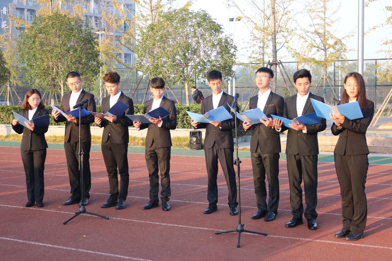 大會分為三個階段。第一階段升旗儀式,由長江大學(xué)國旗護衛(wèi)隊的隊員護衛(wèi)國旗,英姿颯爽,昂首挺胸地將國旗護送至升旗臺。伴隨激昂的《義勇軍進行曲》,同學(xué)們將目光聚集在鮮艷的五星紅旗,冉冉升起的紅旗代表了祖國大地和資環(huán)學(xué)員從晨霧中破曉而出、朝氣蓬勃的模樣。