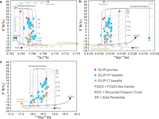 研究團(tuán)隊(duì)發(fā)現(xiàn),峨眉山玄武巖和苦橄巖總體具有比洋中脊玄武巖(MORB)和洋島玄武巖(OIB)更高的B含量(1-53 ppm)、B/Ce比值(0.02-1.59)和更重的B同位素(δ11B高達(dá) +27.62‰)(圖2a-b),顯示一個虧損B的端元向另一個富集B的端元演化的趨勢(圖2)。前人曾提出,峨眉山地幔柱源區(qū)主要由FOZO型虧損地幔與EM1富集組分(再循環(huán)洋殼+沉積物)組成。該模型雖然可以解釋峨眉山巖漿巖Sr-Nd-Pb同位素組成,但是卻無法解釋其B同位素組成(圖3)。虧損地幔以低B/Ce(0.05–0.14)和δ11B為特征;而經(jīng)歷強(qiáng)烈脫水的深俯沖洋殼,亦具有虧損B的特征(δ11B = ~-12‰,120 km);俯沖沉積物的δ11B值范圍為?20‰至?2‰。因此,峨眉山大火成巖省地幔源區(qū)需存在一個富水且具有高δ11B值和高硼含量的附加端元組分。