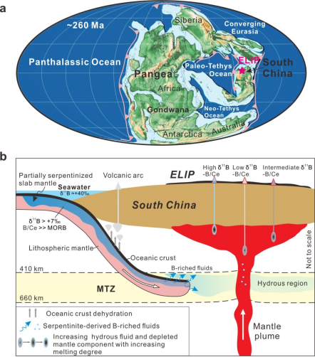 研究團(tuán)隊(duì)結(jié)合區(qū)域地質(zhì)資料以及本次研究結(jié)果,對地球深部水循環(huán)過程進(jìn)行了重建。晚古生代,古特提斯洋板片經(jīng)歷了漫長(奧陶紀(jì)-三疊紀(jì))的冷俯沖過程(圖5),為大洋板片蛇紋巖進(jìn)入深部地幔創(chuàng)造了良好條件。雖然,俯沖板片在弧下地幔深度曾經(jīng)歷了強(qiáng)烈的脫水過程,并在華南西南部形成了大規(guī)模的島弧巖漿作用,但是其較冷的板片結(jié)構(gòu)使其底部的巖石圈地幔蛇紋巖在更高的壓力下向DHMS轉(zhuǎn)變,并將水和流體活動性元素傳輸至地幔過渡帶,這使得華南板塊之下的地幔過渡帶在中/晚二疊世已經(jīng)富水或者局部富水(圖5)。上升的峨眉山地幔柱在穿過地幔過渡帶時,會夾帶其含水物質(zhì),并最終通過大火成巖省將水再循環(huán)至地表(圖5)。
