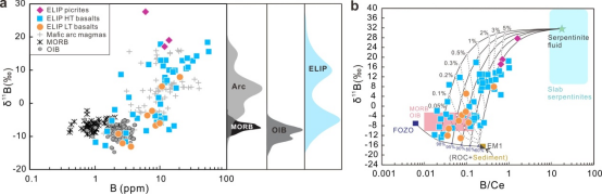 地幔柱是地球深部地幔中上升的高溫、低密度物質(zhì)流,通常起源于核幔邊界并受到地幔過渡帶影響,是地球內(nèi)部物質(zhì)和能量傳輸?shù)降乇淼闹匾翱凇I仙牡蒯V鶗l(fā)大規(guī)模的巖漿活動,形成大火成巖省,出露地表的巖漿巖是地球內(nèi)部物質(zhì)組成的重要“巖石探針”。硼(B)作為流體活動性元素,在巖漿與變質(zhì)過程中的釋放行為與水的遷移密切相關(guān)。地表儲庫與地幔中的B含量和同位素組成相差甚遠(yuǎn),例如海水具有較高的B含量(~4.5 ppm)和重B同位素(δ11B ≈ +40‰)組成;而虧損地幔具有非常低的B含量(< 0.1 ppm)和輕B同位素(δ11B = ?7.1 ± 0.9 ‰)組成;海水與巖石圈地幔反應(yīng)形成的蛇紋巖具有高B含量(可高達(dá)100 ppm)和重B同位素(δ11B 可高達(dá)+40‰)組成。基于此,對大火成巖省巖漿巖進(jìn)行B含量和B同位素分析,有望為地球深部水的來源及其循環(huán)過程提供關(guān)鍵線索。