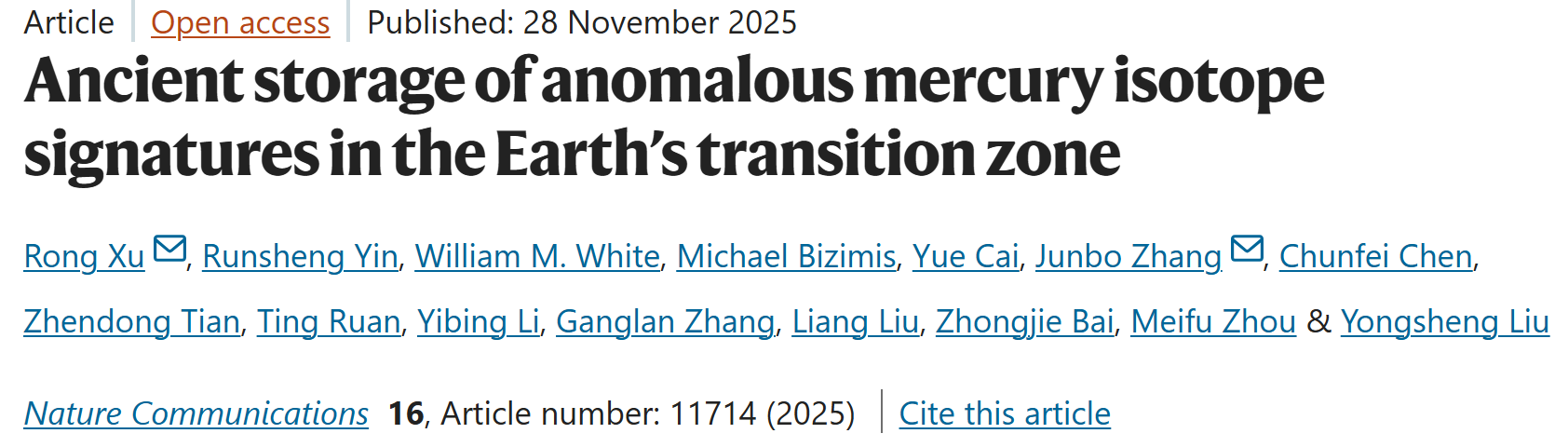 Authors: Rong Xu (徐榮)*, Runsheng Yin (尹潤(rùn)生), William M. White, Michael Bizimis, Yue Cai (蔡悅), Jun-Bo Zhang (張軍波)*, Chunfei Chen (陳春飛), Zhendong Tian (田振東), Ting Ruan (阮婷), Yibing Li (李儀兵), Ganglan Zhang (張崗嵐), Liang Liu (劉亮), Zhongjie Bai (柏中杰), Meifu Zhou (周美夫) & Yongsheng Liu (劉勇勝)